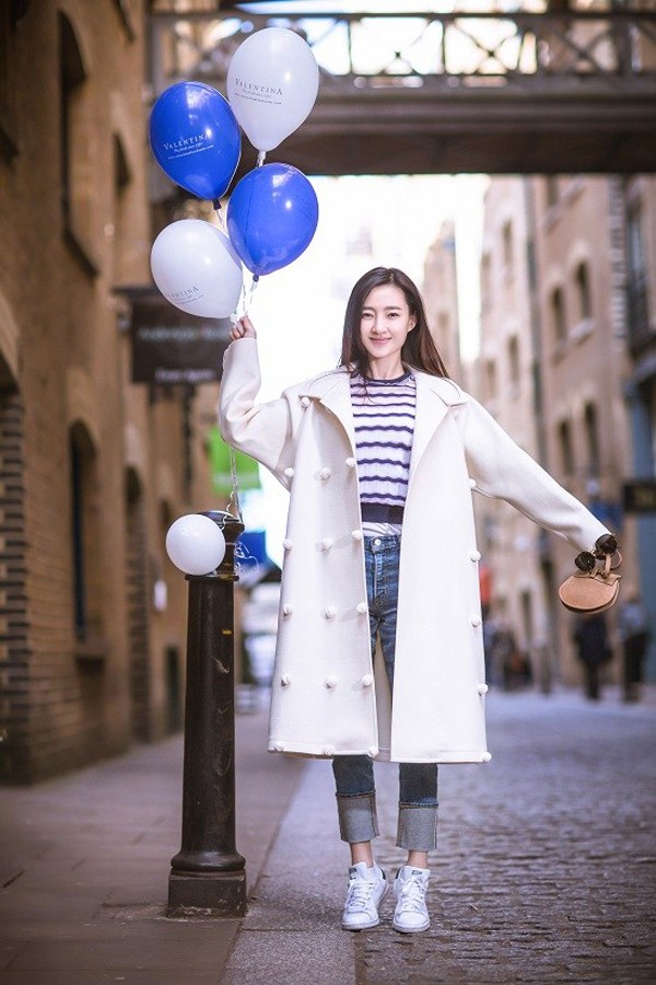 东方女神邂逅英伦古巷 蓝色气球点亮静谧街角