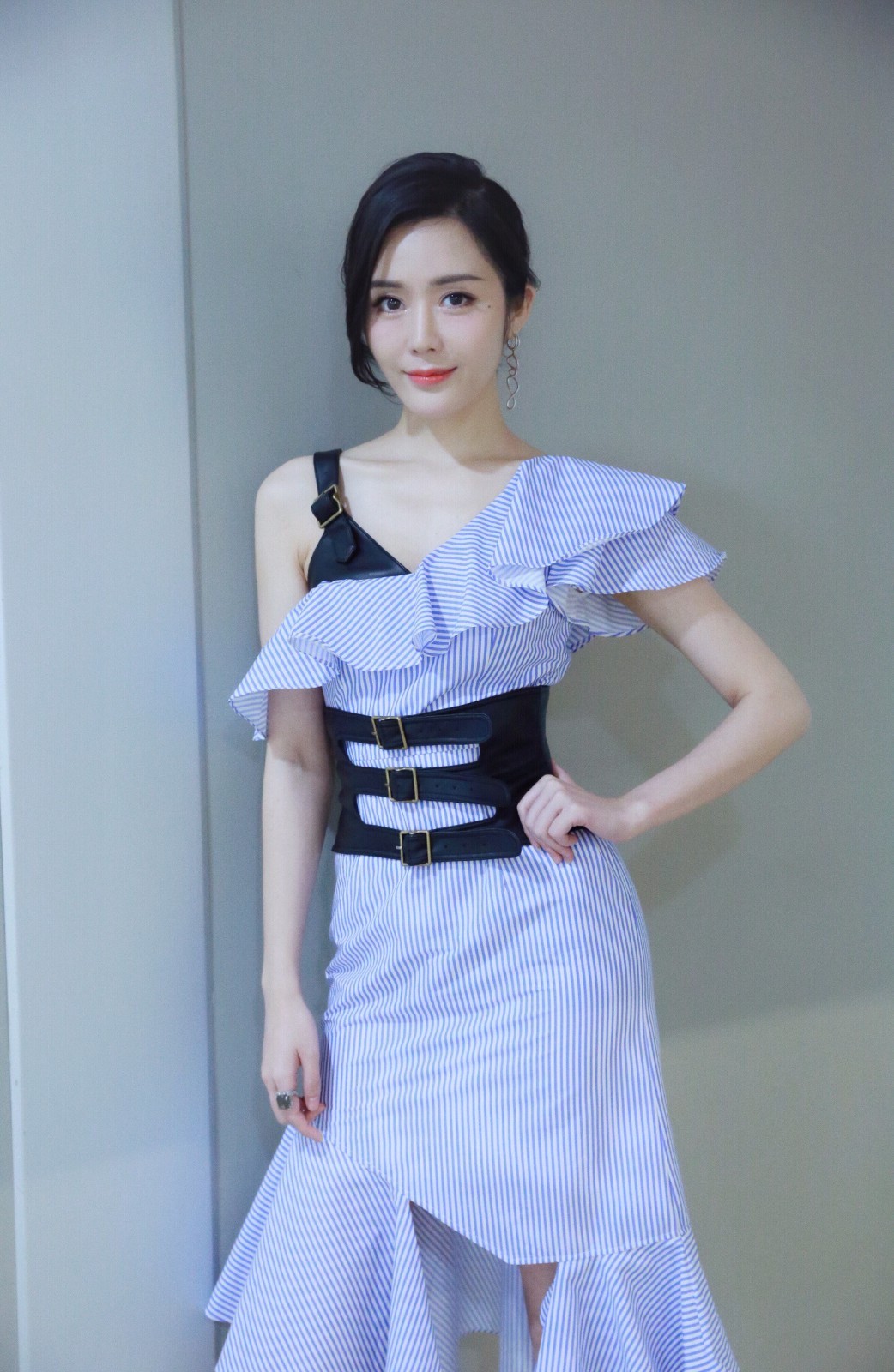 汤晶媚直面镜头展露自信微笑,礼服上身精致的立体剪裁与腰部收紧设计凸显其玲珑身段